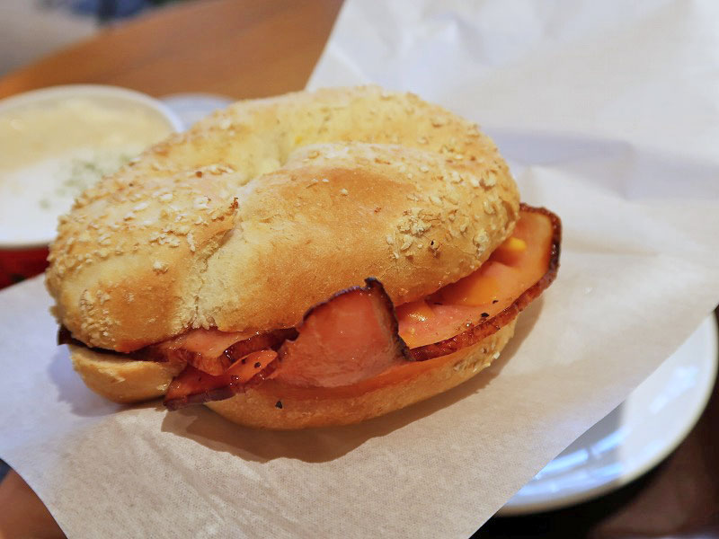 「ベーコンエッグチーズベーグルサンド」はジューシーなベーコンと卵に、チーズがとろけるホットベーグル。チーズのしょっぱさがクセになります。