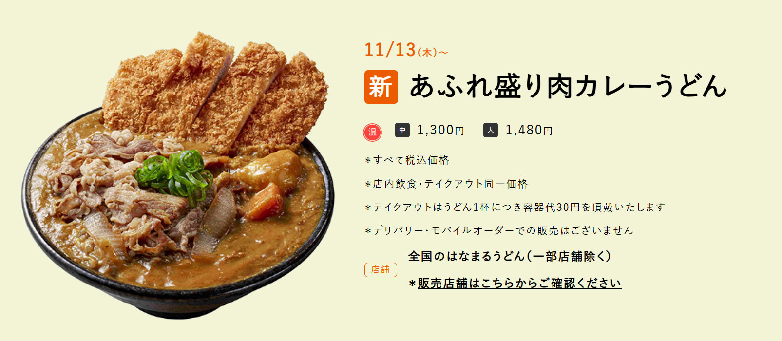 総重量1kgに迫る圧巻の“背徳グルメ”「あふれ盛り肉カレーうどん」が登場中です。
