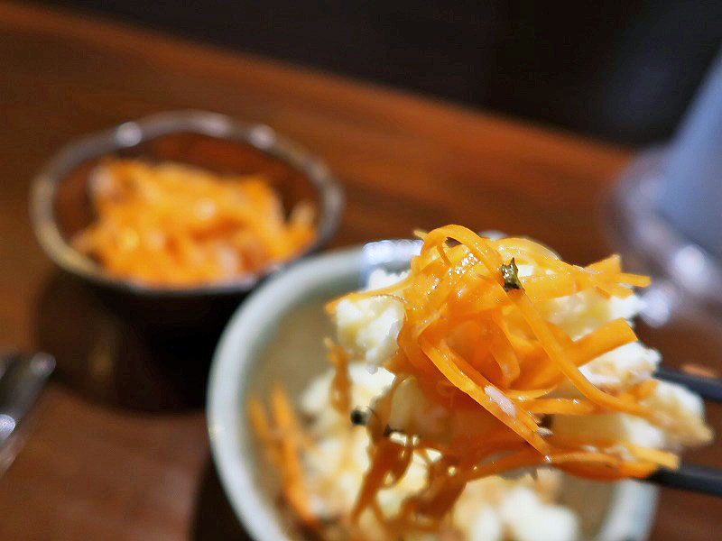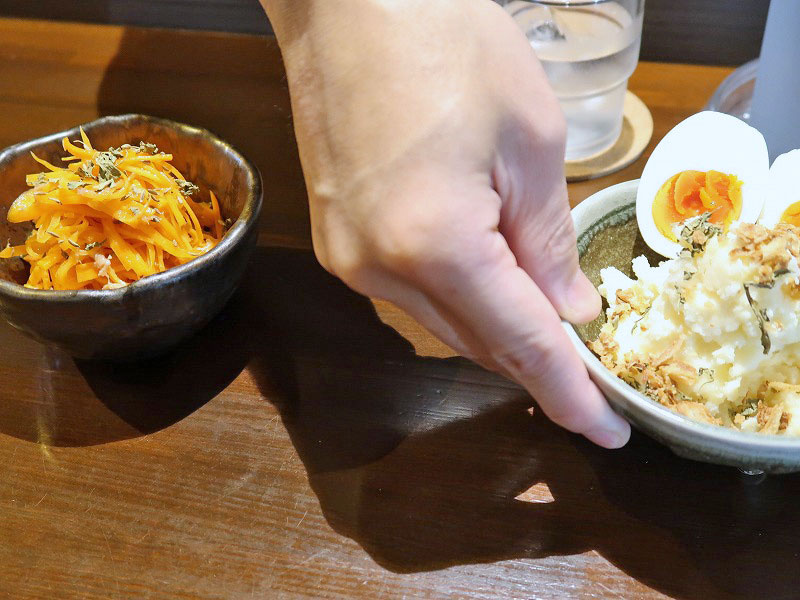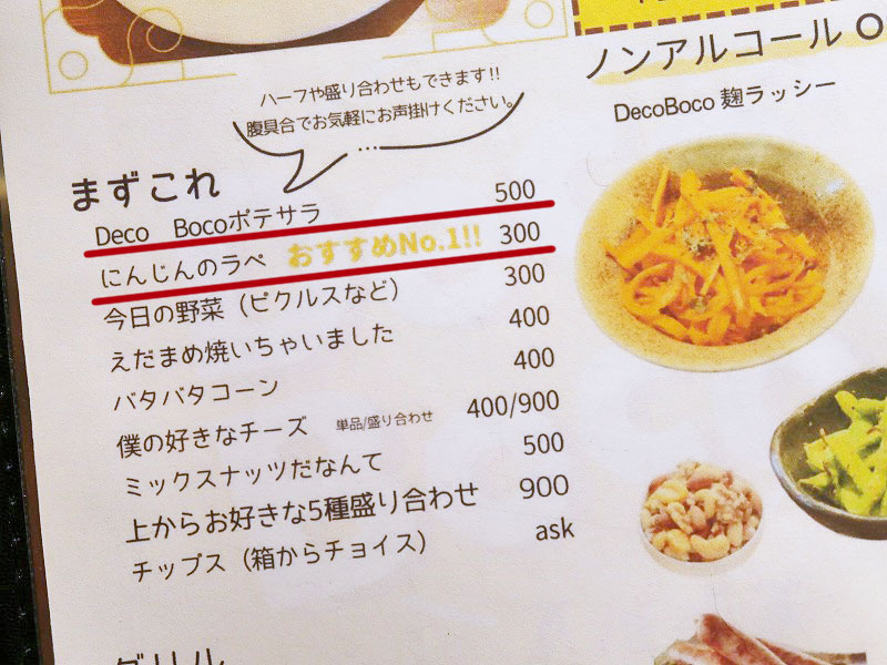 店主さんオススメの「にんじんのラペ」と、店名が入ってる「Deco Bocoポテサラ」をオーダー。
