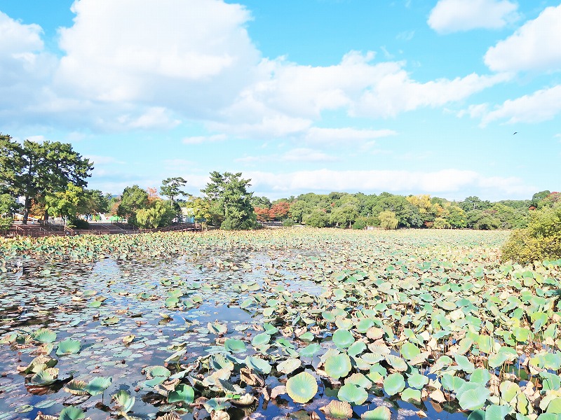 橋からの眺めは…蓮の季節は夏なので、11月の今は正直言って綺麗ではないですねぇ。