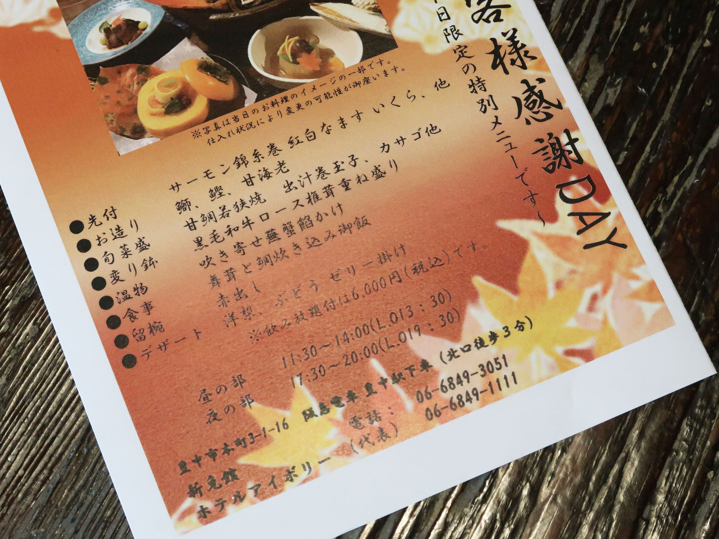 先日本町3丁目にある「ホテルアイボリー」の山西さんから「和食レストラン新免館に新しい料理長が就任しましたので、イベントにいらっしゃいませんか?」とお誘いいただいたので、お邪魔してきましたよ。