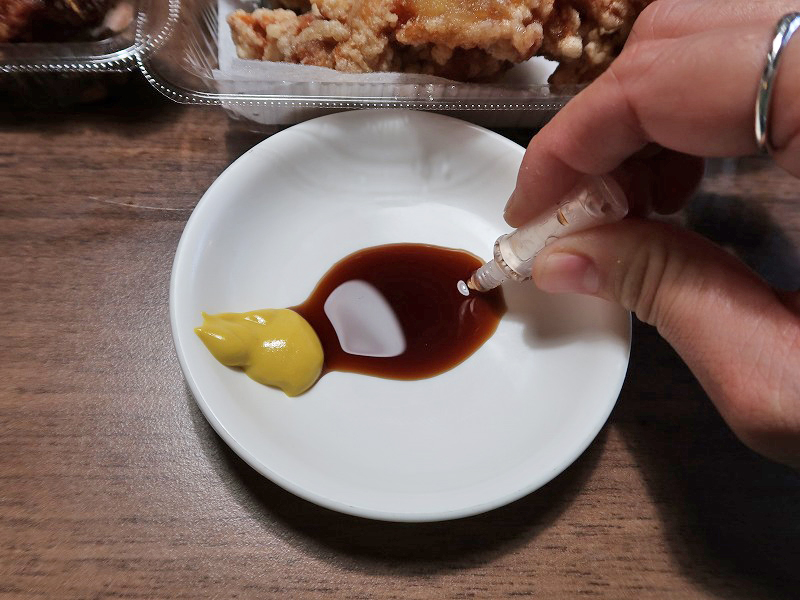 からしとソースも試してみようかな。ソースはさらっとしているのでウスターソースかな?