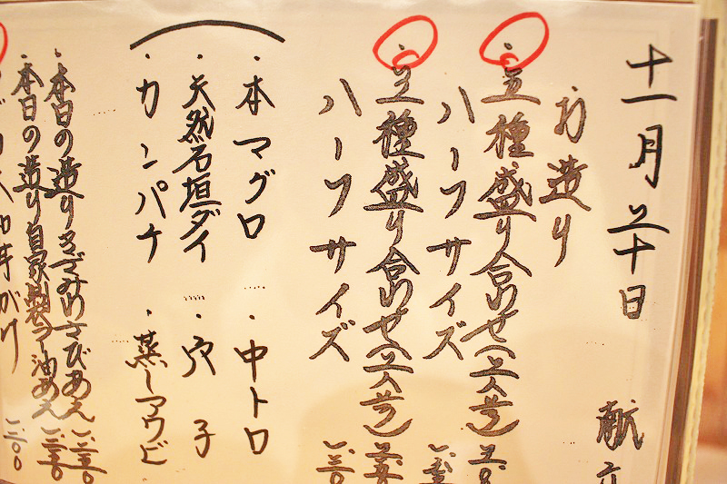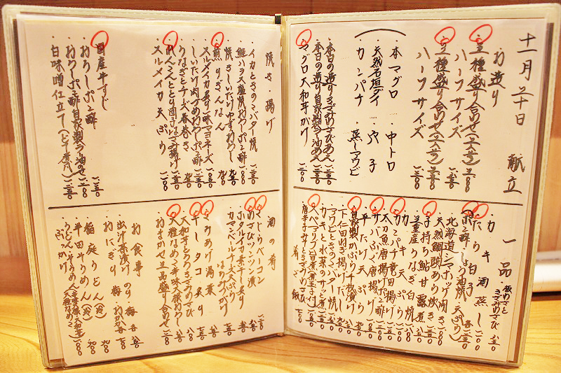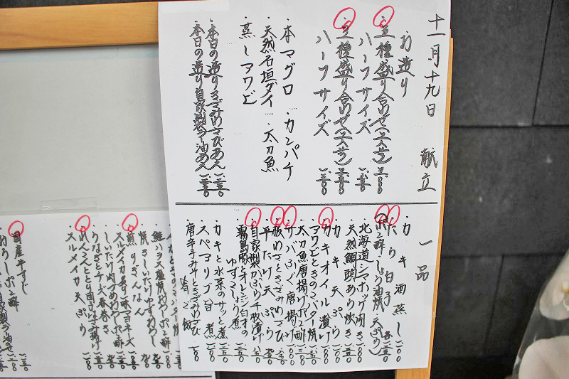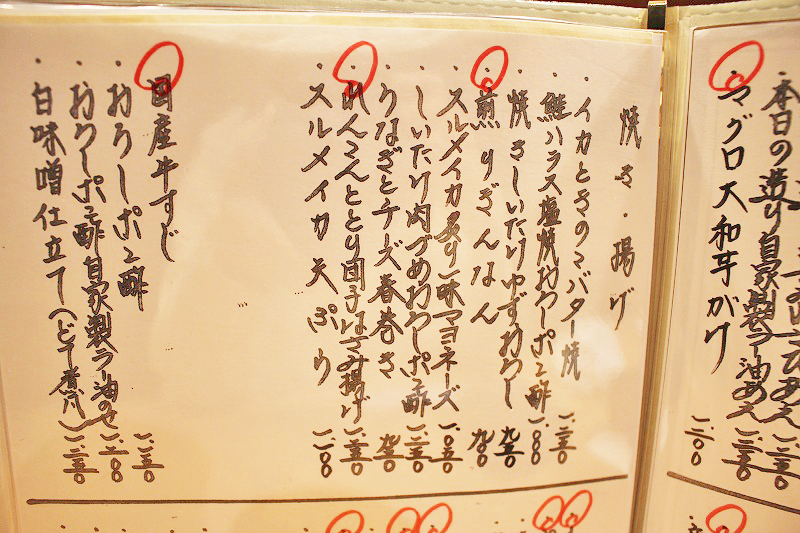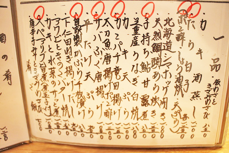 毎日市場で仕入れる旬の食材を使うので、メニューは日によって変わるそう。赤丸のメニューが本日のオススメなんだって。