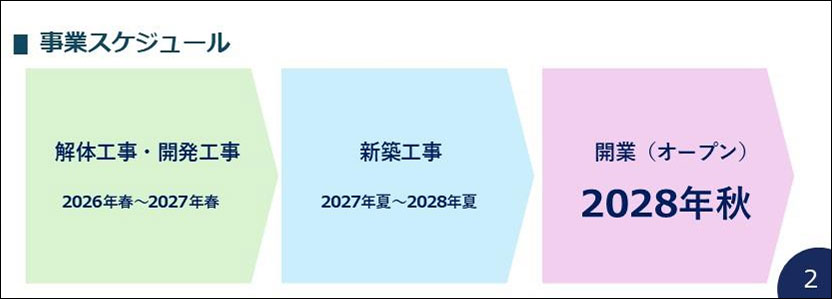事業のスケジュールはこんな感じで、3年後の2028年秋ごろにオープンする計画なんだって。