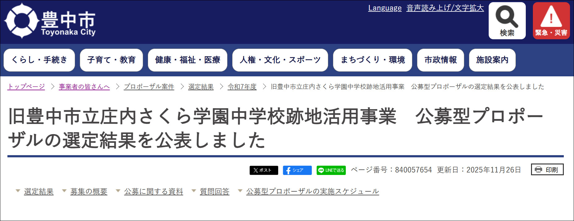 「旧豊中市立庄内さくら学園中学校」は令和5年(2023年)3月に廃校となっており、跡地を活用する民間事業者を公募型プロポーザル方式で募集していたんですよね。
