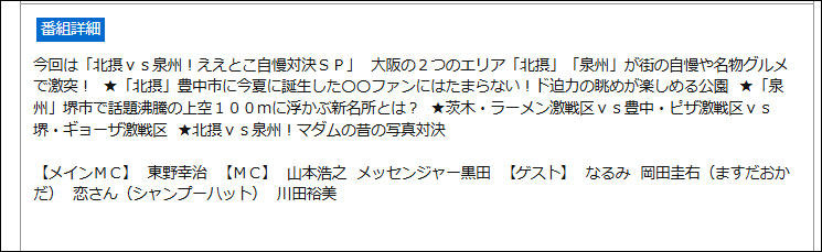 「テレビ王国」の番組詳細によりますと「北摂vs泉州!ええとこ自慢対決SP」と題して、大阪の2つのエリア「北摂」「泉州」が街の自慢や名物グルメで激突するみたい。