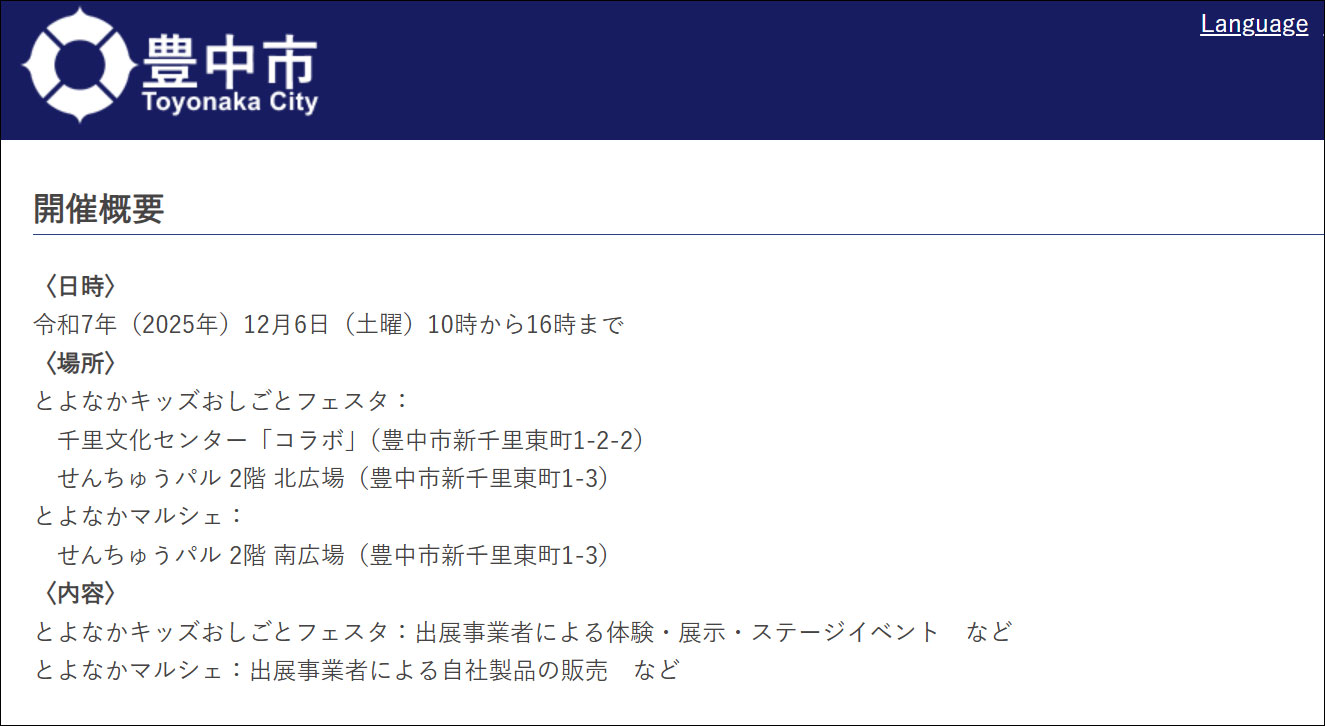 開催日時は12月5日(土)の10時~16時です。(チラシはこちら豊中市ホームページより引用