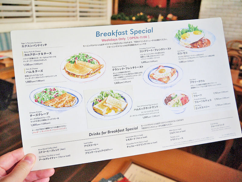 平日の11時までは「ロコ・モコ」や「アサイーボウル」等が楽しめる、ブレックファストメニューもあるんですね。