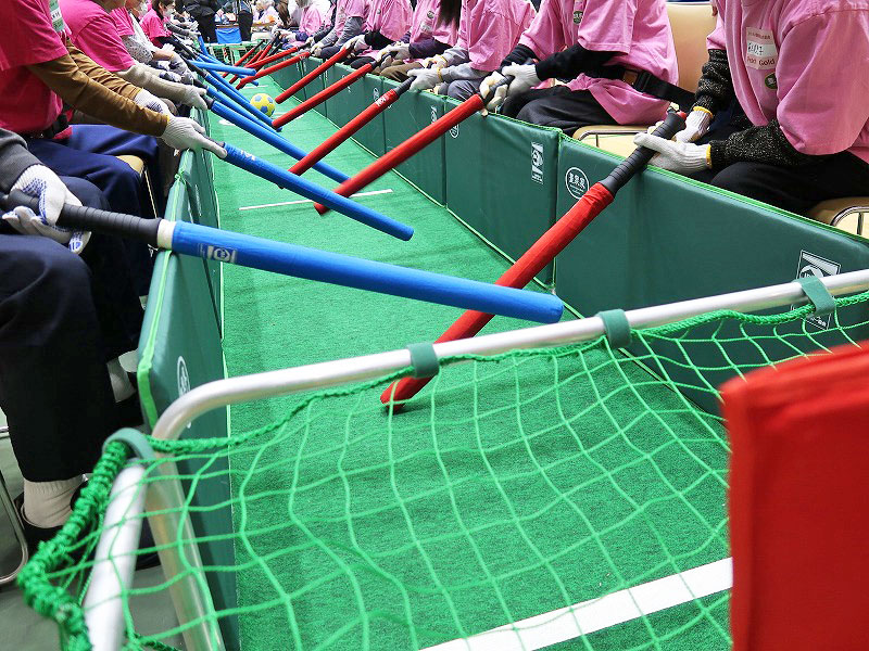 向かい合わせに座った両チームが、中央のコートに置かれたボールをスティック(棒)を使って