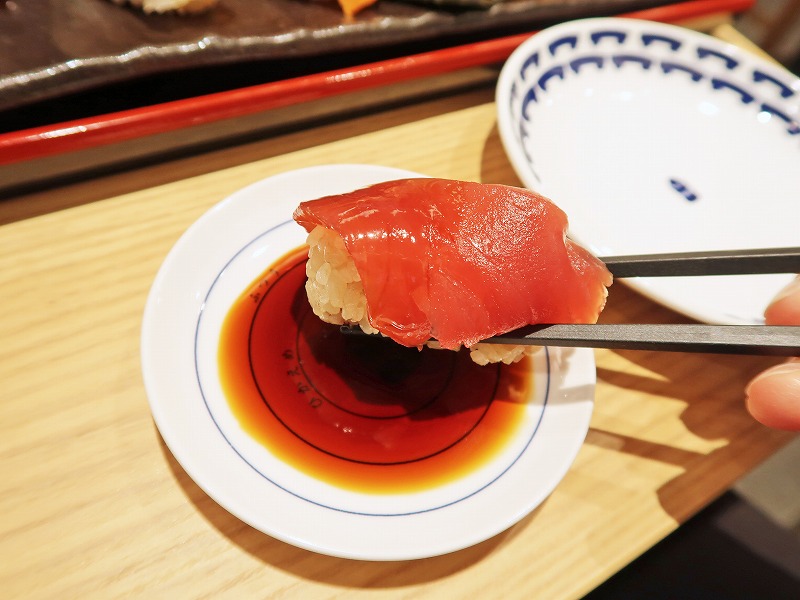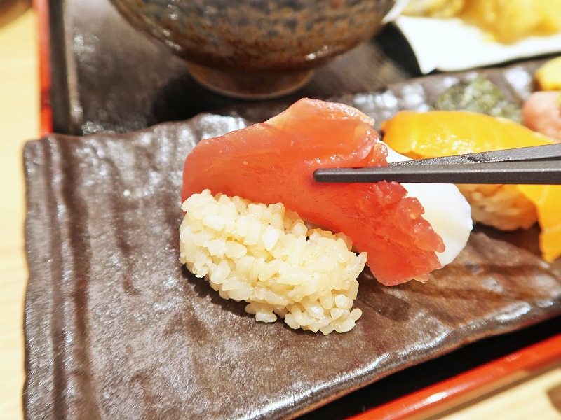 マグロの厚みはこんな感じ、、、ん?なんかシャリが白くないぞ??