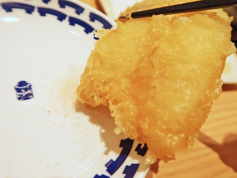 岩塩がオススメとの事なのでちょっとつけて。外サク中ふわな白身魚です。