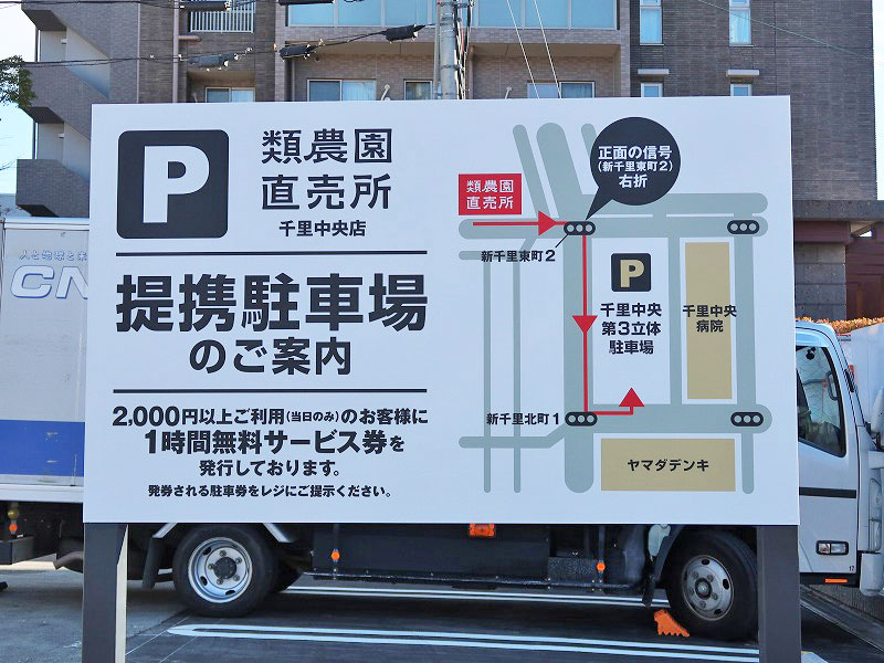 2,000円以上購入されると、近くの「千里中央第3立体駐車場」の1時間無料サービス券が発行されるそうなので