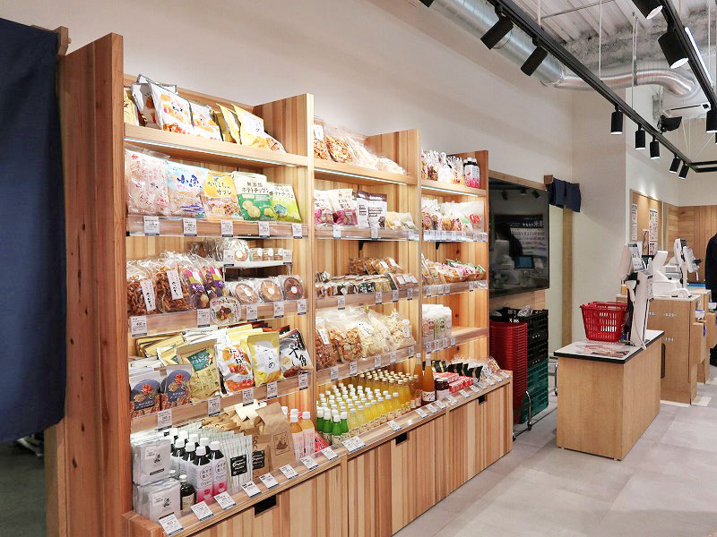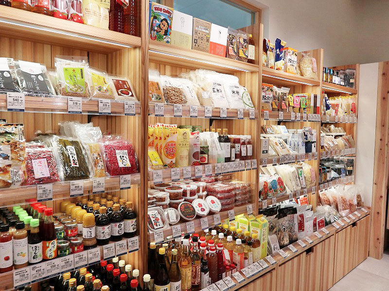 野菜が並ぶ奥には、乾物や調味料などが置かれていますね。