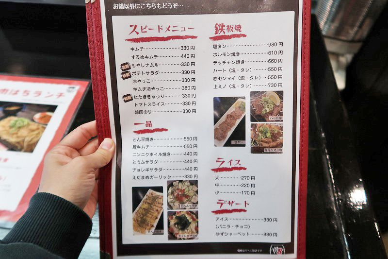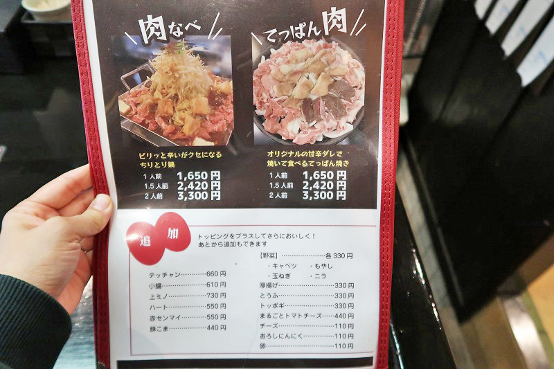 「肉なべ」「てっぱん肉なべ」か。どれも1人前から注文できておひとり様も楽しめますね。
