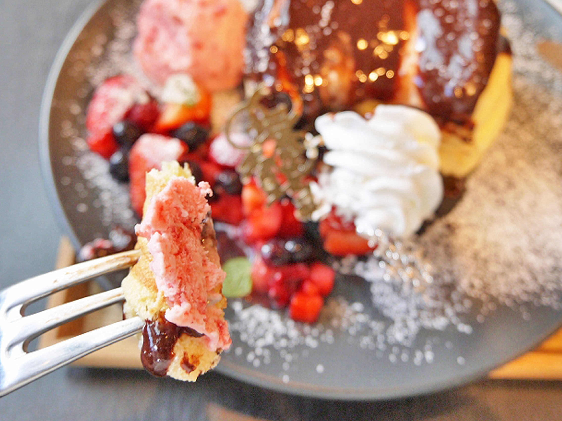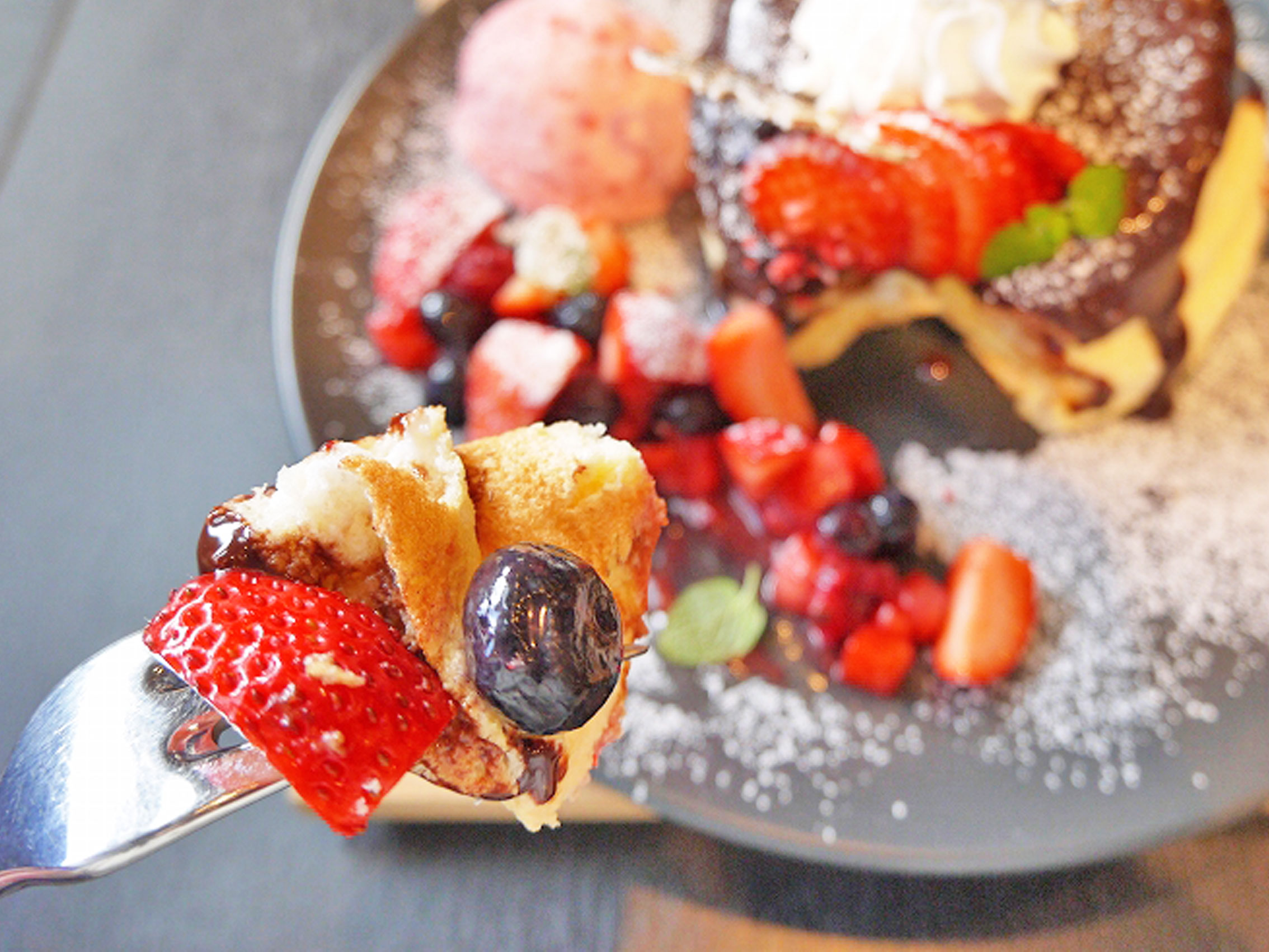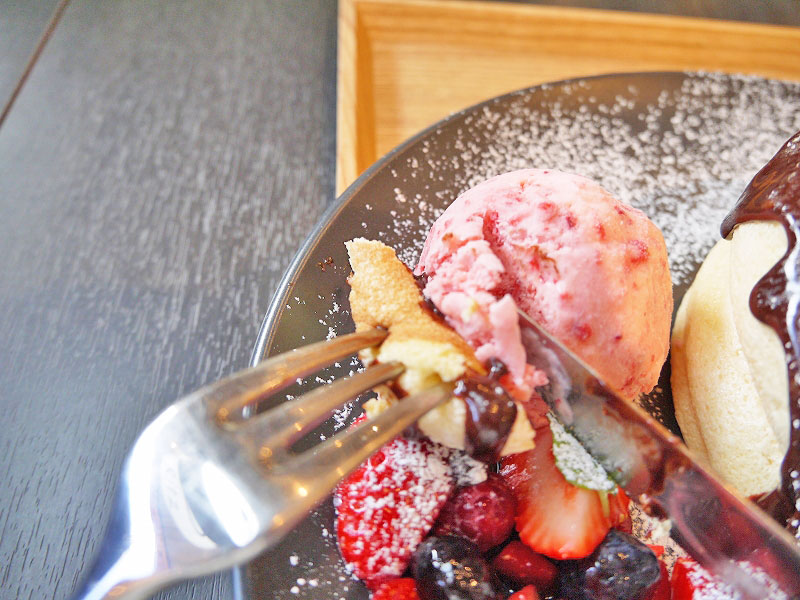 ふわふわなパンケーキの上にたっぷり乗ったチョコレートソース。ベリーもこれだけ沢山だともはやメイン。