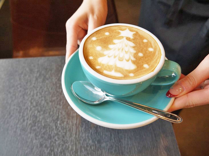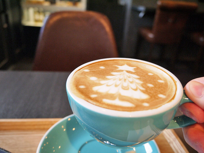 そこに流し込む「カフェラテ」は、しっかり渋くて本格派。ツリーのラテアートでほっこり気分。