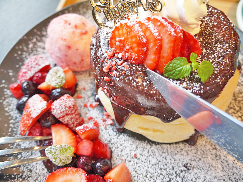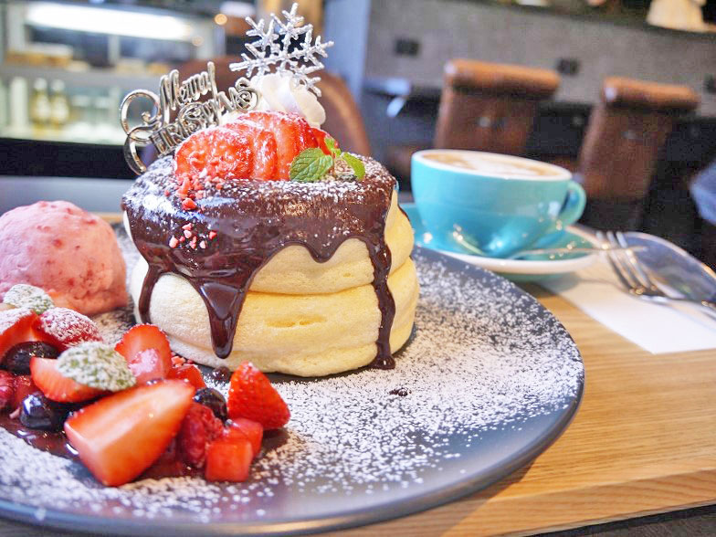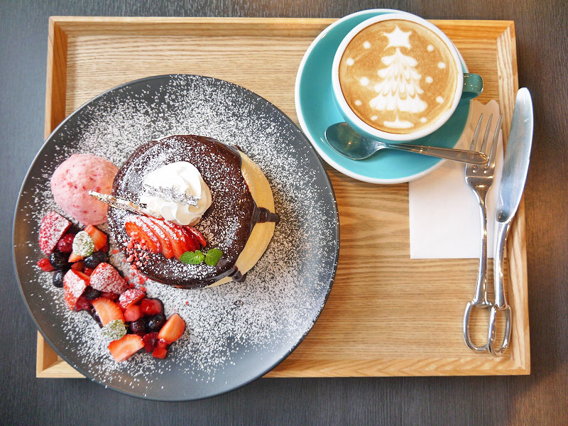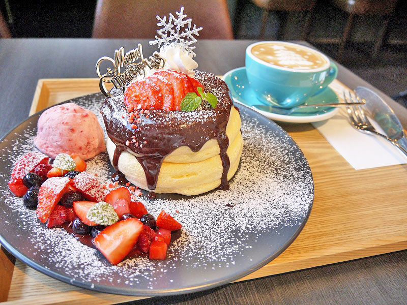 ※クリスマスパンケーキ(1900円)、カフェラテ(500円/パンケーキとセットで100円引)/すべて税込