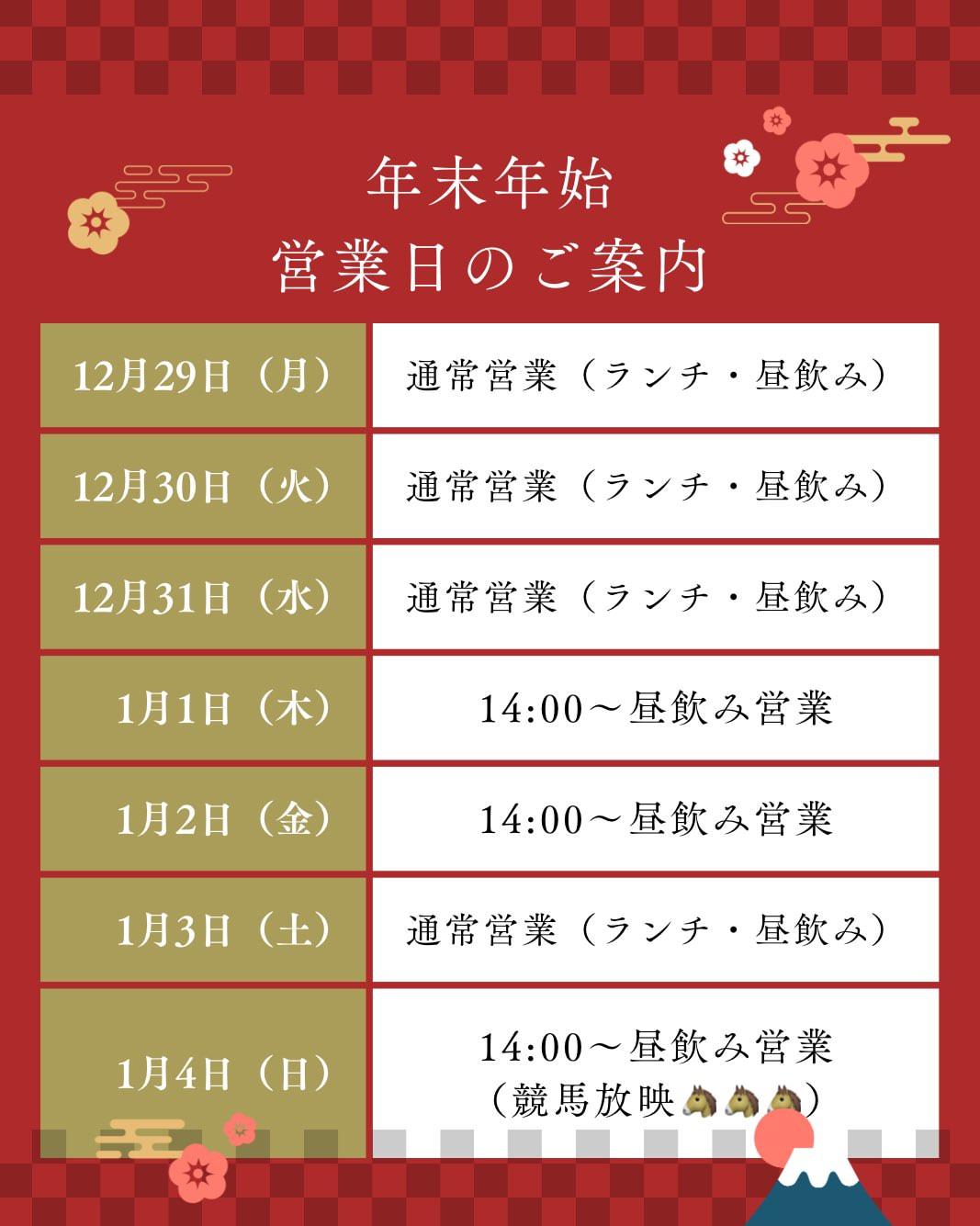 年末は31日まで通常営業、年始もなんと元日14:00から昼飲み営業されるとのことで