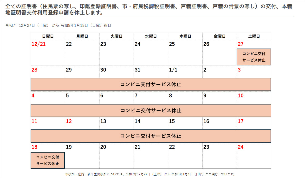 豊中市の「コンビニ交付サービス」が12月27日(日)~1月18日(日)の間休止するようです。