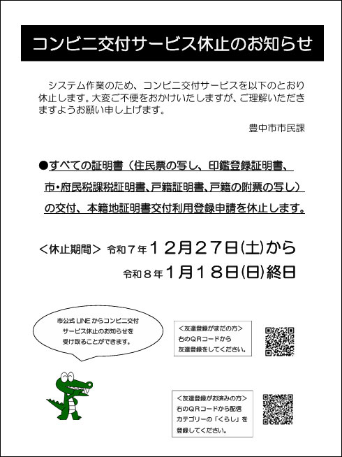 あくまで「コンビニ交付サービス」が休止するだけであって、豊中市役所の窓口で取得できるんですが・・・