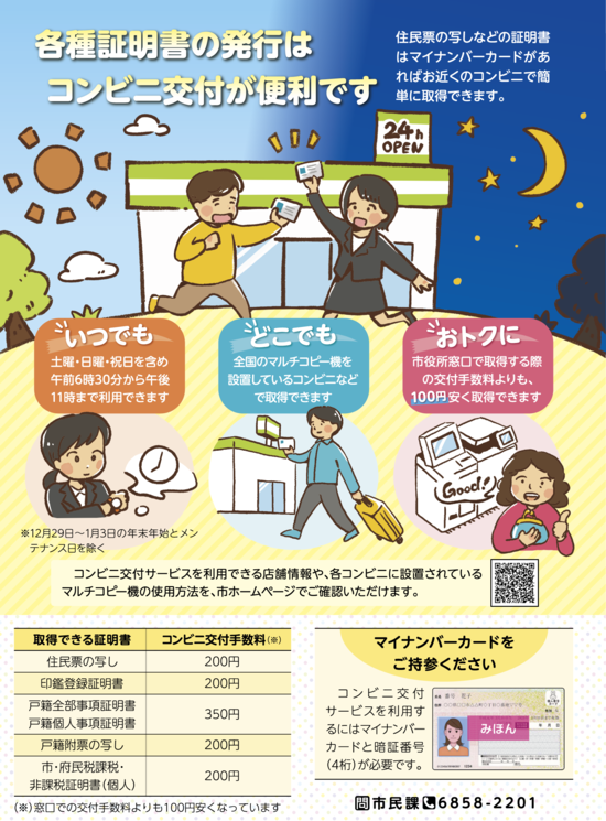 「コンビニ交付サービス」とは、マイナンバーカード(個人番号カード)または住民基本台帳カードを使用して、コンビニなどの「マルチコピー機」で各種証明書が取得できるサービスのこと。豊中市ホームページより引用