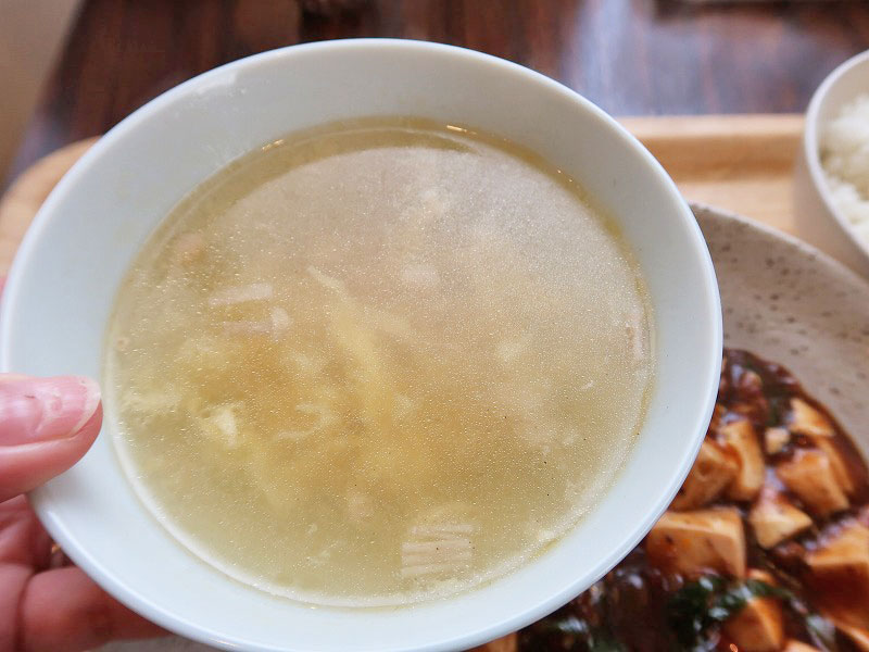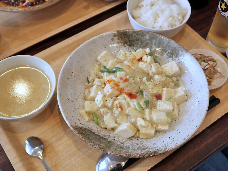 「麻婆豆腐定食」。ご飯とスープと小鉢、デザート付きです。