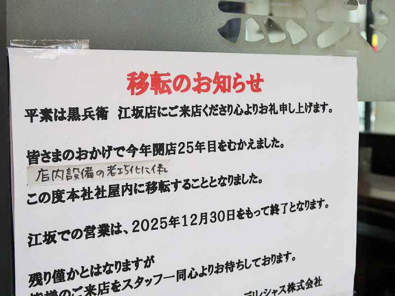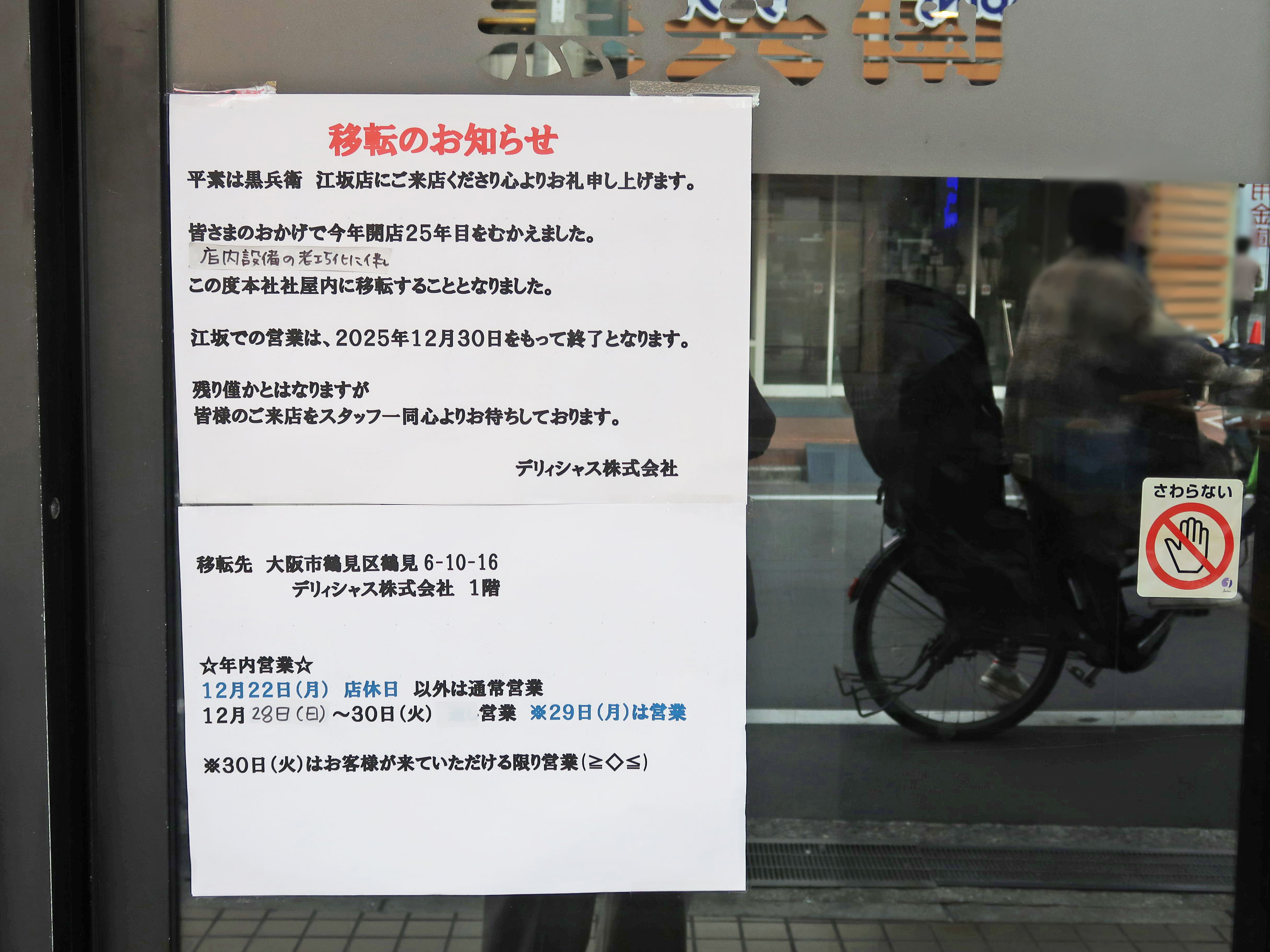 江坂駅近くの豊津町にある「黒兵衛 江坂店」が閉店していました。