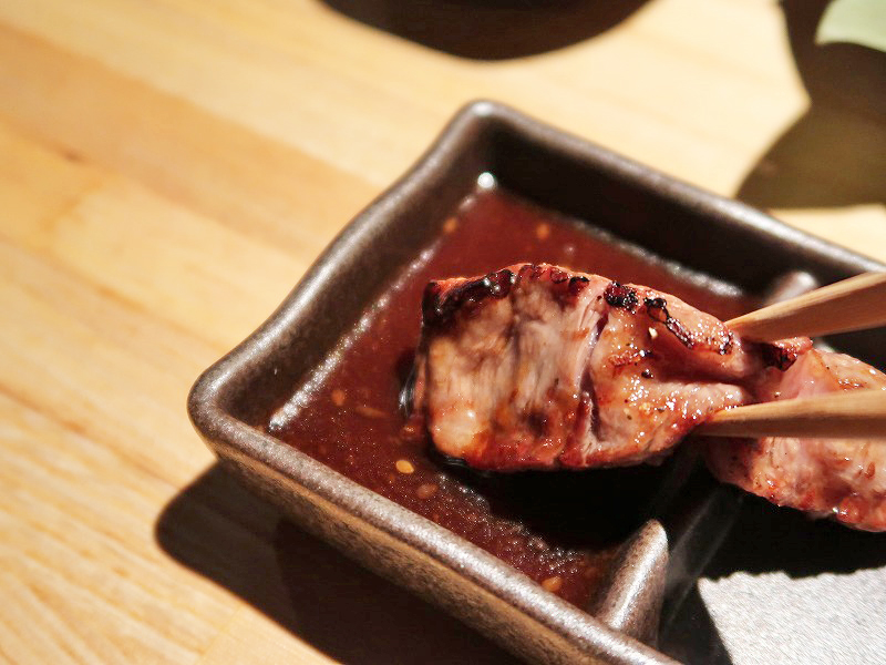 タレにつけましてっと。わ、箸で割れるくらい柔らかいっ!