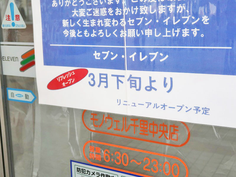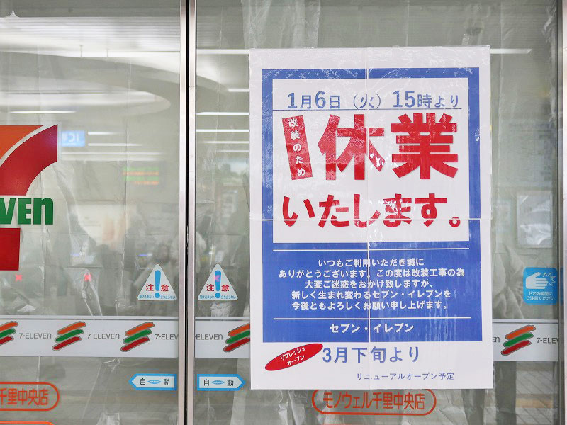 新千里東町にある「セブンイレブン モノウェル千里中央店」が休業していました。