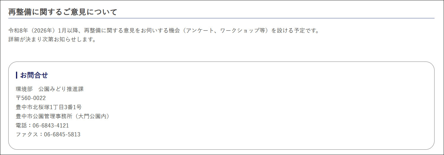 これから再整備に関する意見を出していく形になりますので(アンケート、ワークショップ等)、気になる人はぜひ参加してみてください。豊中市ホームページより引用