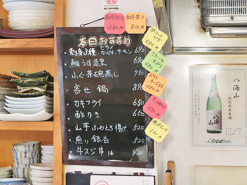 おすすめの黒板には名古屋メシ以外にもお刺身やステーキ、ピザなんかもあります。