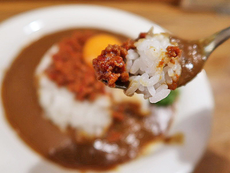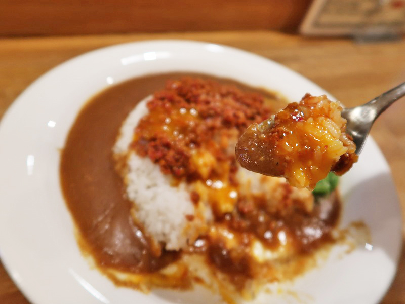 ここにひき肉を併せていただくと、しっかりした辛さのひき肉がまろやかカレーと不思議とマッチ。