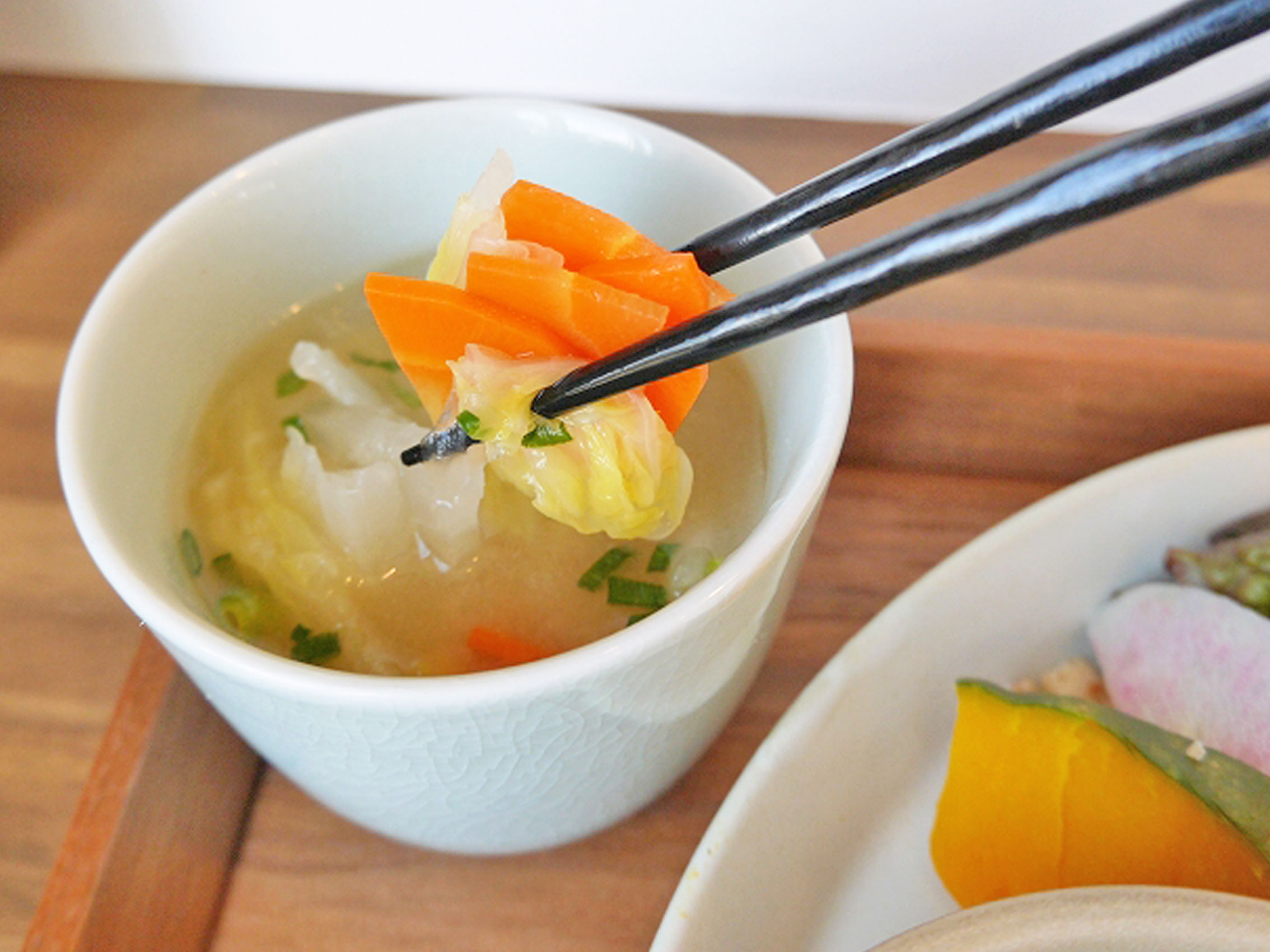 まずは、温か~いお味噌汁を一口。白菜にニンジンにおネギ・・・お出汁がしっかり効いた優しいお味のお味噌汁です。