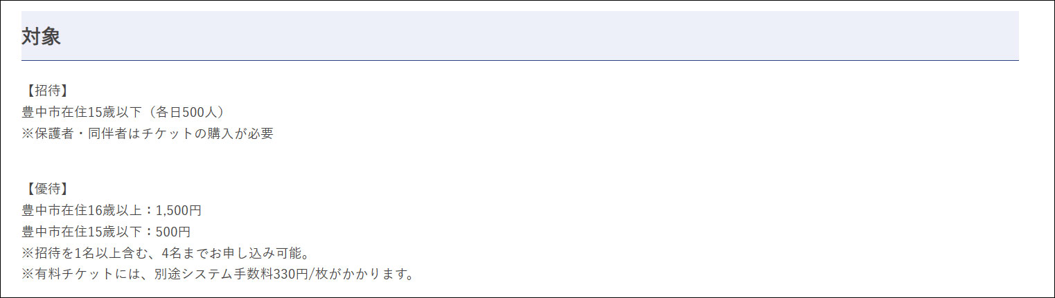 15歳以下は無料。そして招待1名を含む優待4名までは優待価格でチケットを購入できるみたい。(専用申し込みサイトからの購入が必要です)