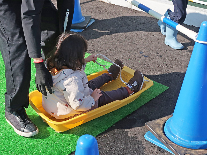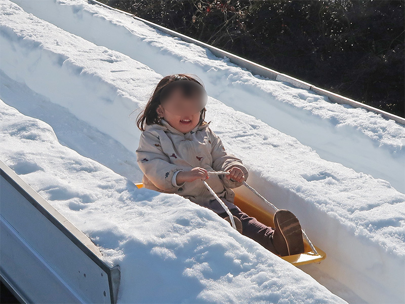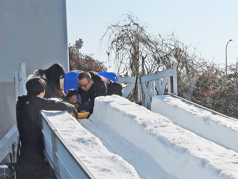 「次はソリがしたい!」というので「雪の滑り台」の列に並ぶことに。