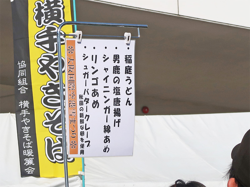※稲庭うどんや唐揚げ、クレープ、リンゴ飴と子どもも好きそうなメニューが多くて子連れにもありがたいです