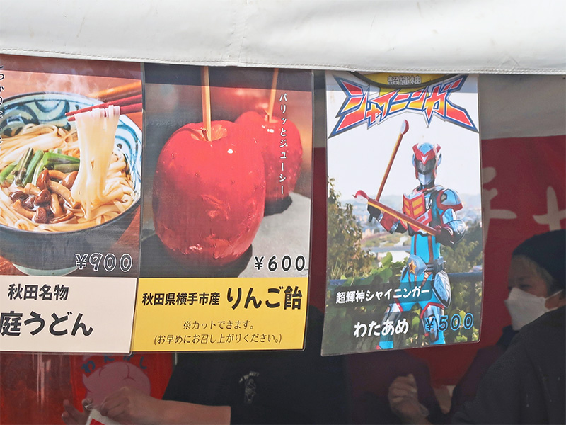 お隣は稲庭うどんや男鹿の塩唐揚げ、りんごあめにクレープに・・・「シャイニンガーわたあめ」?