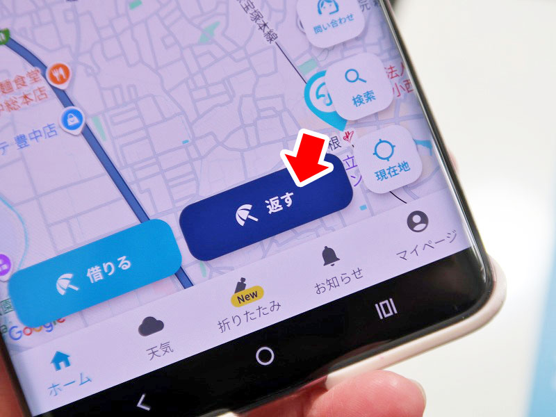 スタンドのQRコードを読み込み、次は「返す」ボタンをタップ。