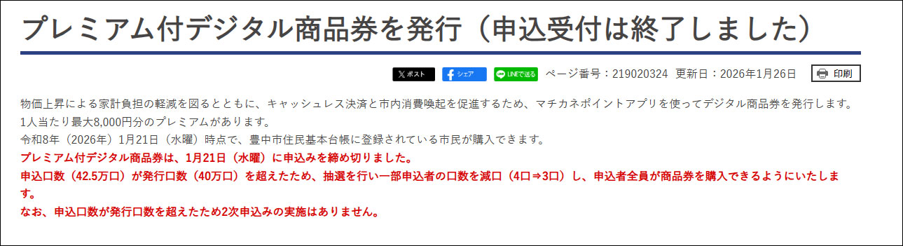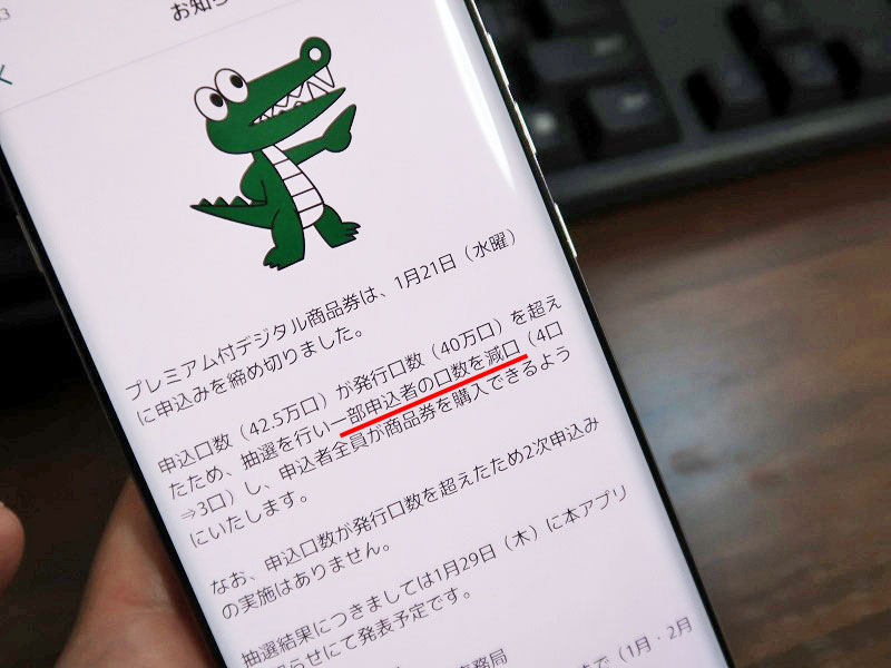 「プレミアム付デジタル商品券」の申込口数が発行口数を超えたので、一部申込者の口数が減口されるようです。