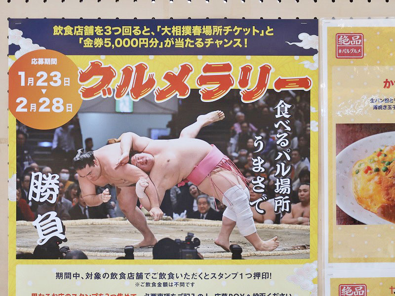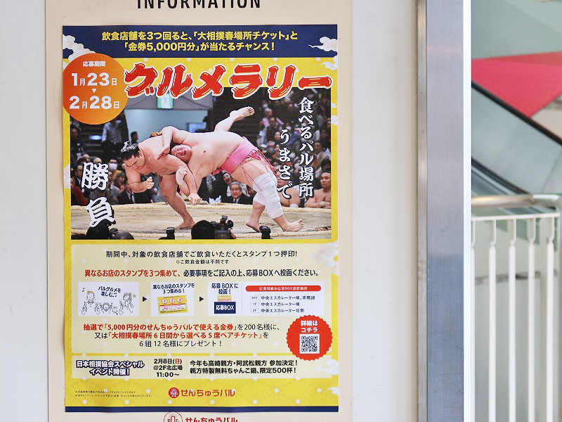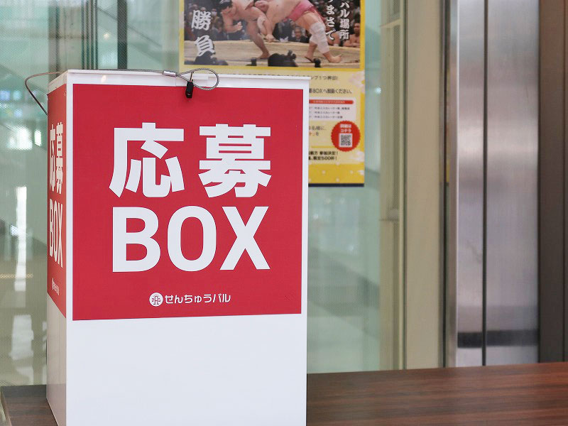 必要事項を記入して「応募BOX」へ入れると「金券5,000円」や「大相撲 春場所のチケット」が抽選で当たる企画です。