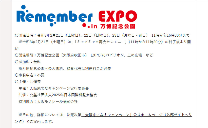 2月21日(土)~23日(日)に開催される「Remember EXPO in 万博記念公園」のオープニングイベントとしてセレモニーが行われるみたい。