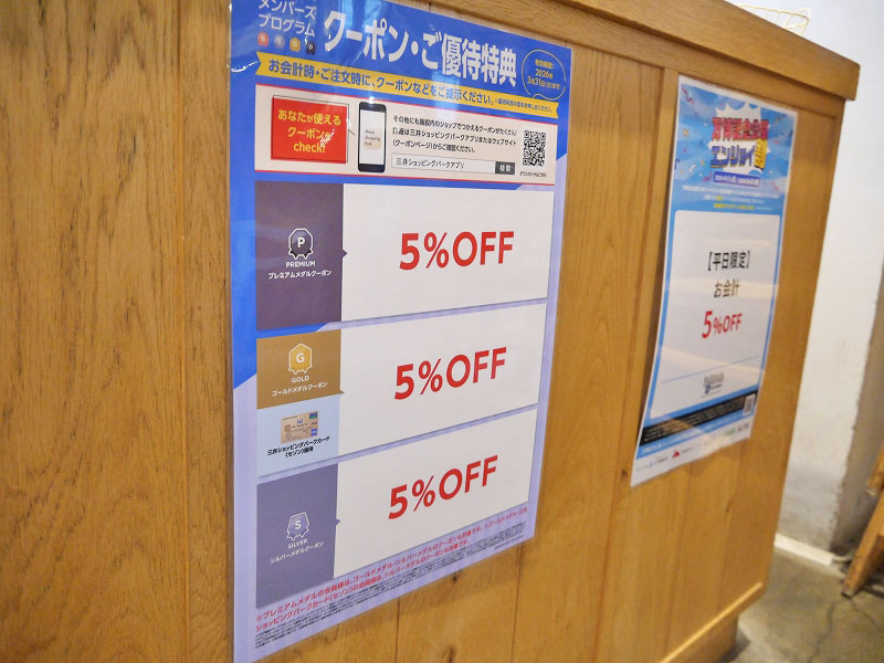 お会計は各種カード払いOKですが「三井ショッピングパークカード」だと5%OFFでしたよ。