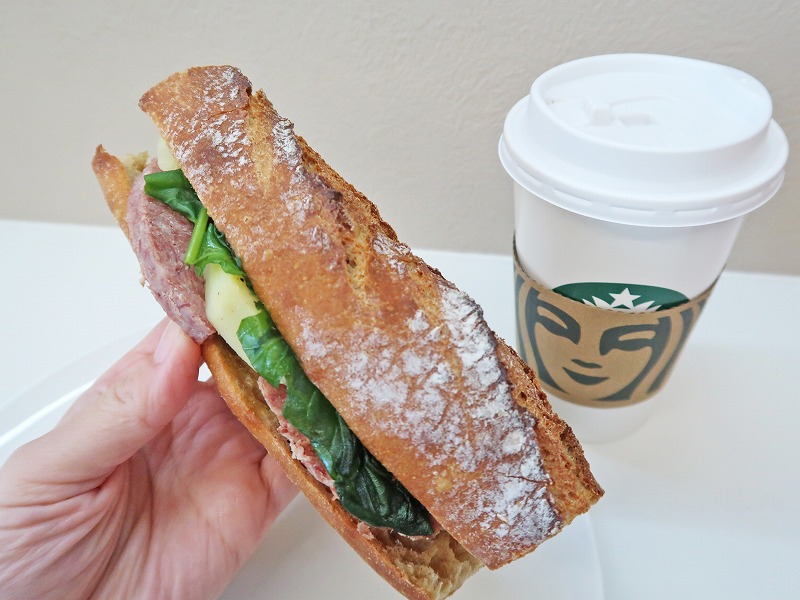 バケットサンドは、すっごく大きくて食べ応えありそう。比較対象のスタバは、大きいグランデサイズだよ。