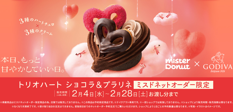 中でも「トリオハート ショコラ&プラリネ」は「ミスドネットオーダー」の予約限定で、2月28日までの販売となるそう。