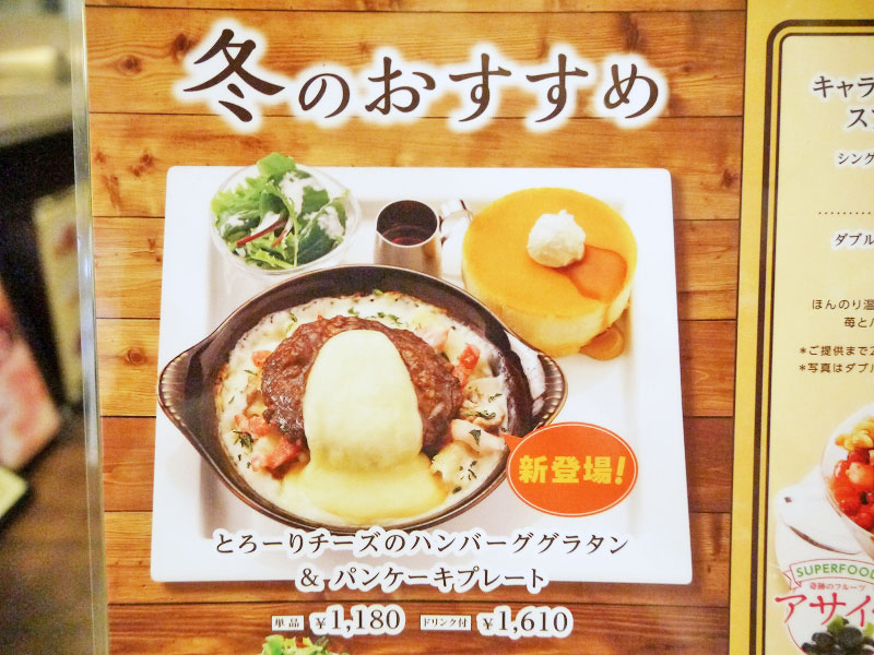 これ美味しそう♪「とろーりチーズのハンバーググラタン&パンケーキプレート」のドリンク付きにしよっかな。