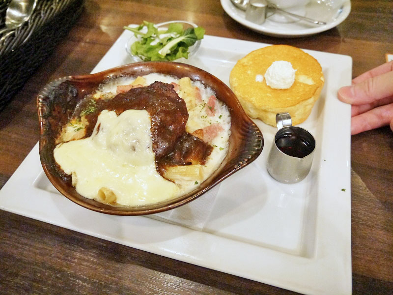 「とろーりチーズのハンバーググラタン&パンケーキプレート」も出来上がりましたよ~。