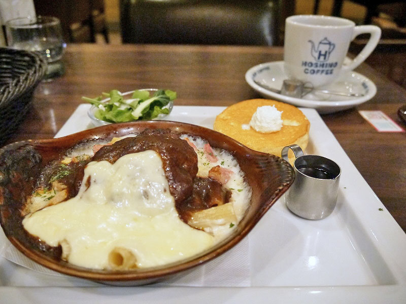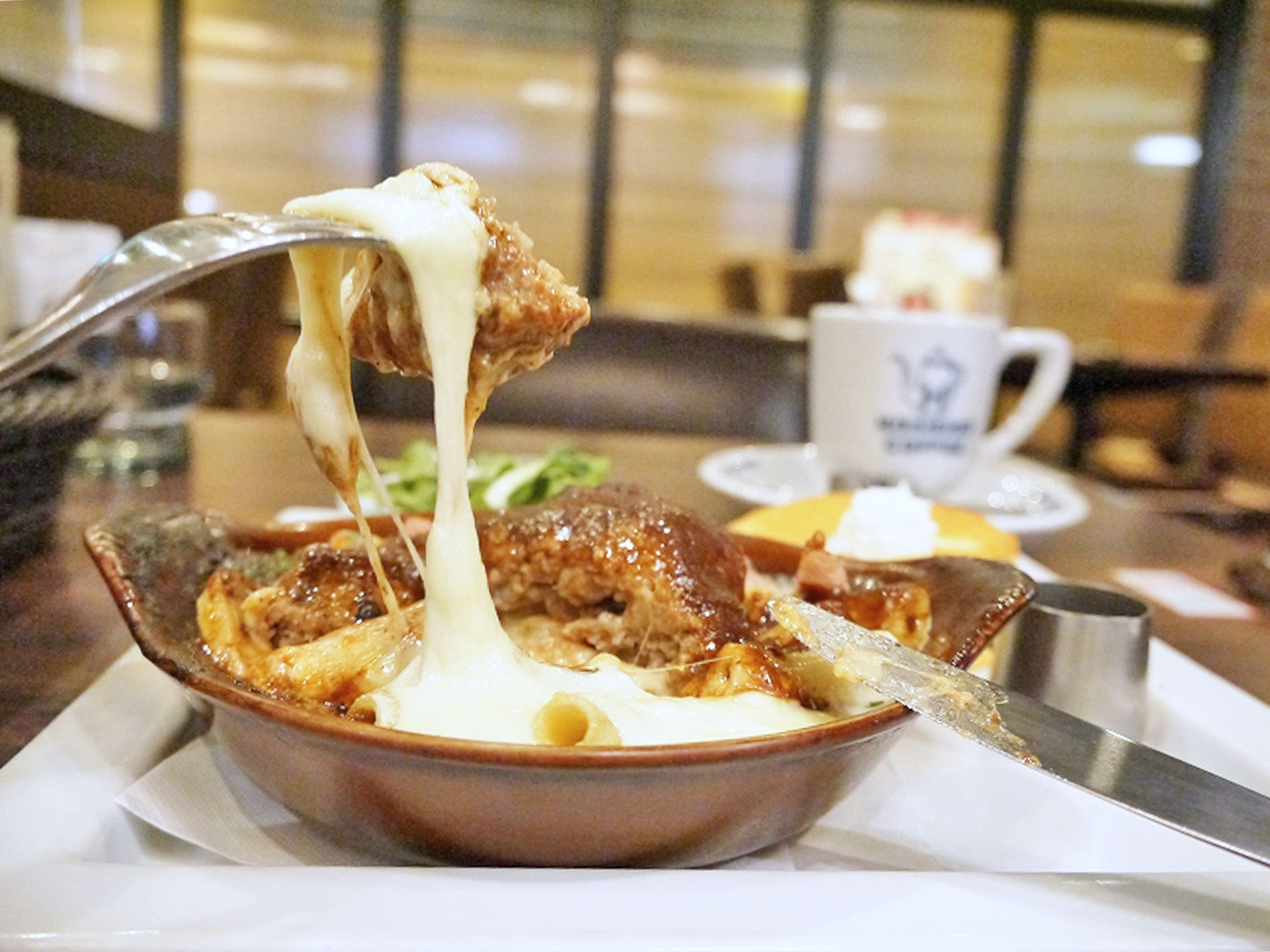 ※とろーりチーズのハンバーググラタン&パンケーキプレート(1180円)、ランチドリンク(11時~14時)(380円)/税込/各種カード払いOK
