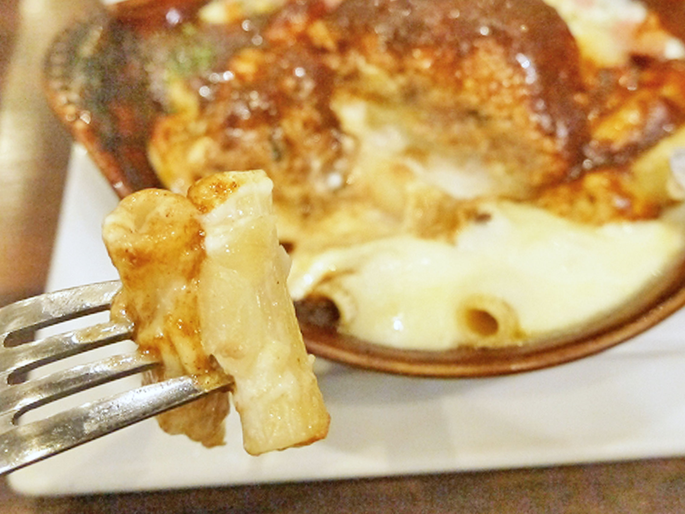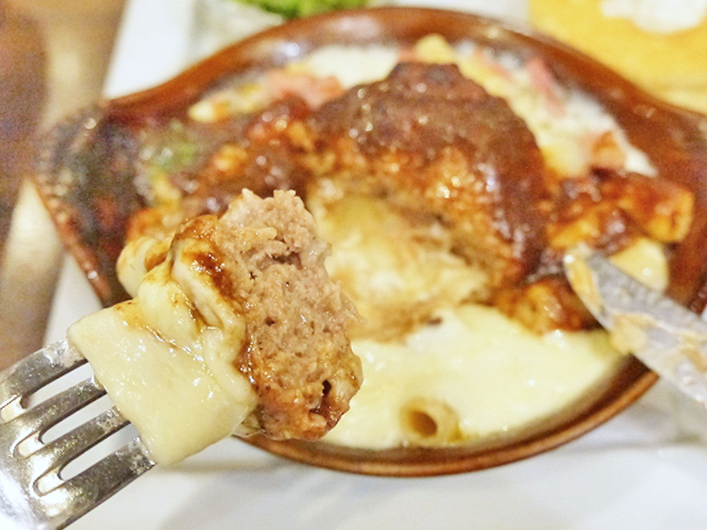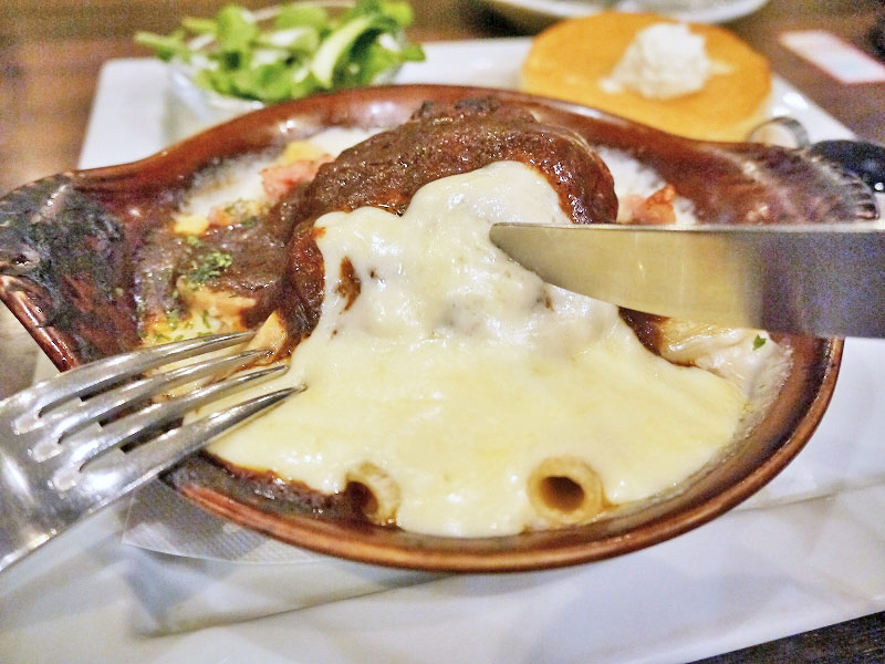ハンバーグの下にはマカロニが。太目のマカロニの中には肉汁やチーズが潜んでて、気を付けないとヤケドしそうなほど熱々。