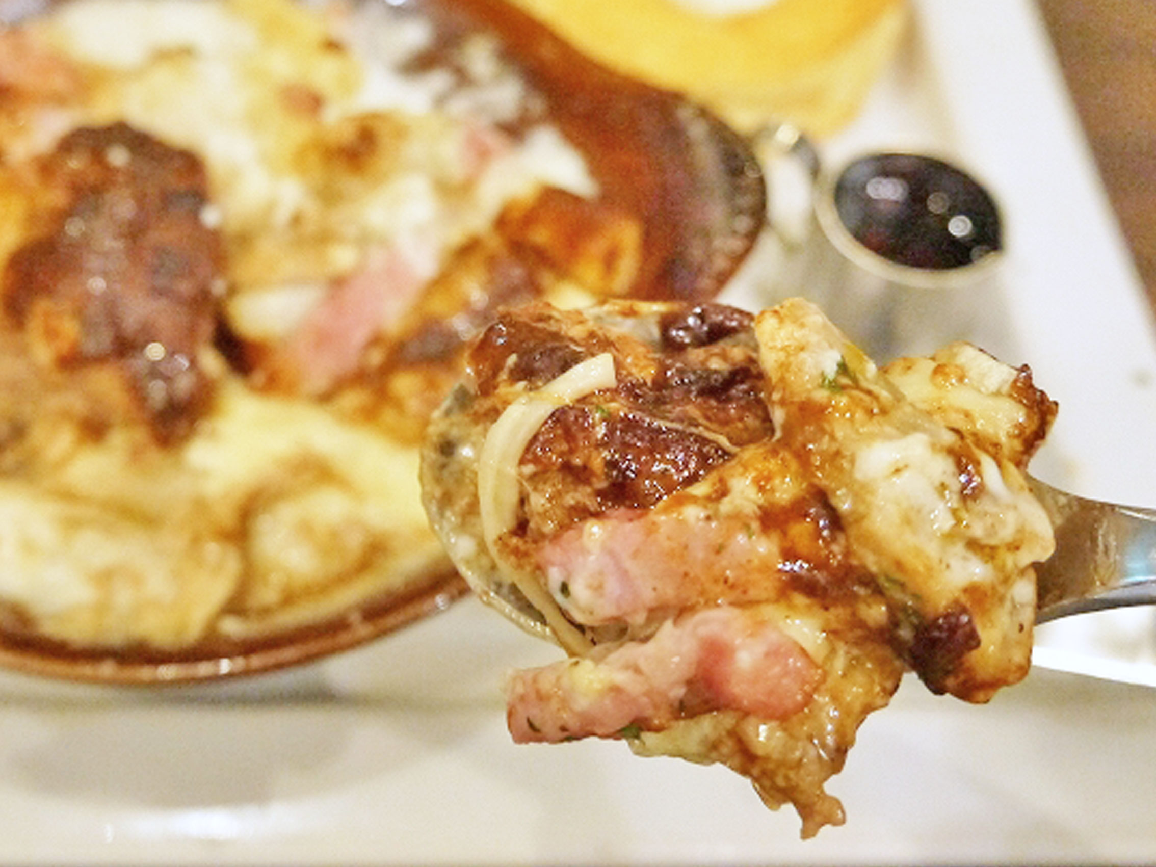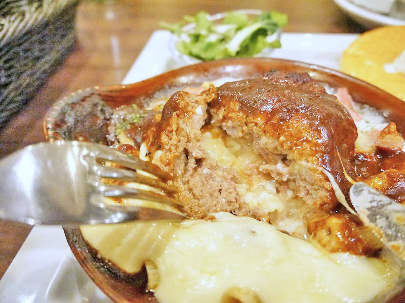 旨味が詰まったジューシーなハンバーグに、ソース&ミルキーなチーズが絡まって食欲そそるぅ。