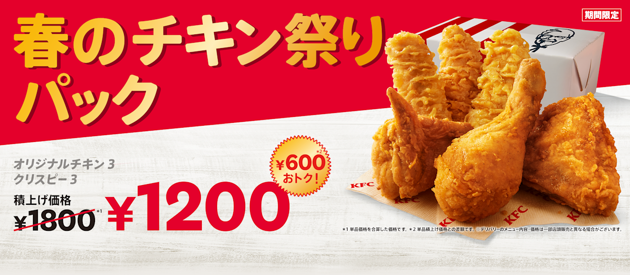 「春のチキン祭り」が開催中。オリジナルチキンとクリスピーが計6個入ったチキンパックが600円も値引きされていますよ。
